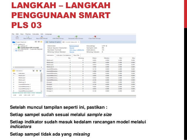 Simulasi SmartPLS Structural Equation Modeling berbasis Variance Pengujian hipotesis dalam penelitian ini menggunakan metode Partial Least Square PLS. Partial least square PLS adalah jenis analisis statistik mirip SEM. Tampilan Smart PLS terdiri dari tiga jendela diantaranya jendela projek jendela variabel atau indikator dan jendela tempat struktural model di gambar.